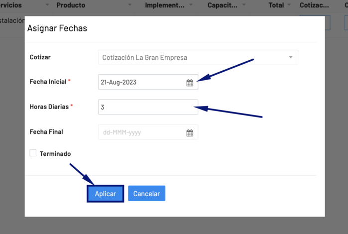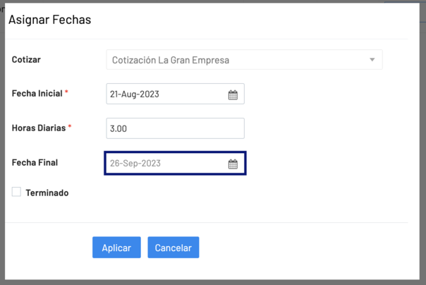 El campo Fecha Final se calculará con base a la fecha de inicio, la cantidad de horas diarias y el total de horas cotizadas en el proyecto. Se mostrará una vez que se apliquen los cambios.