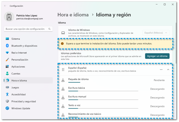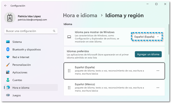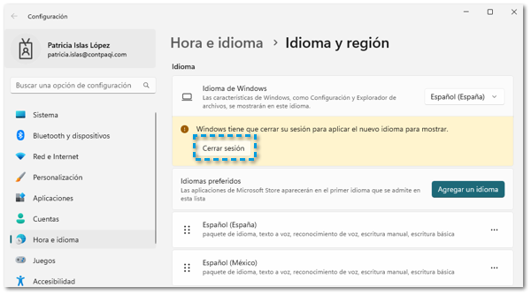 Inicia sesión en tu equipo, y verifica que el idioma configurado sea Español (España).