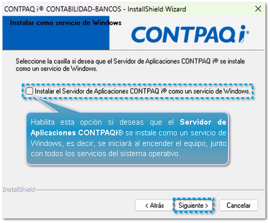 Si deseas que el Servidor de Aplicaciones CONTPAQi® inicie como un servicio de Windows, habilita la siguiente opción y haz clic en Siguiente.