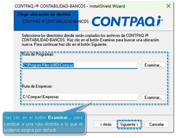 Antes de iniciar el proceso de instalación, se mostrará una ventana que te indicará las rutas por default del sistema: Ruta de Programas (Ejecutables del sistema) y la Ruta de Empresas, haz clic en el botón Siguiente.