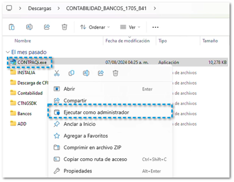 En la carpeta descomprimida en la que se descargó el sistema, encontrarás el instalador CONTPAQi Contabilidad-Bancos, haz clic derecho sobre él y ejecútalo como Administrador para iniciar la instalación.