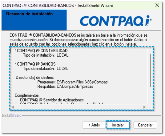En la siguiente ventana, se visualizará un Resumen de instalación del sistema CONTPAQi Contabilidad-Bancos con sus respectivos complementos. Presiona el botón Instalar para continuar con dicha instalación.