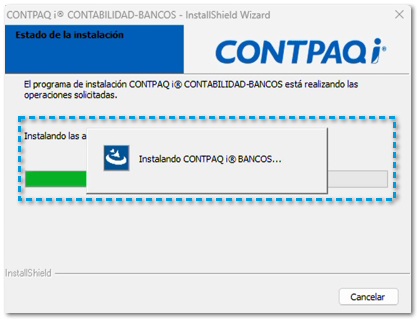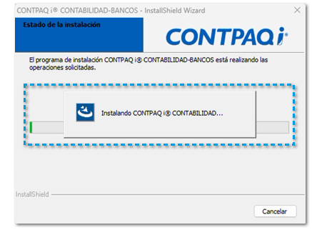 ![]() Se mostrará el avance de la instalación, durante el avance indicará la instalación de CONTPAQi Contabilidad® y CONTPAQi Bancos®.