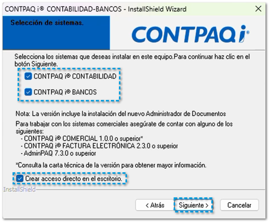 Selecciona los sistemas a instalar, en este caso realizaremos la instalación de ambos sistemas (CONTPAQi Contabilidad® y CONTPAQi Bancos®).