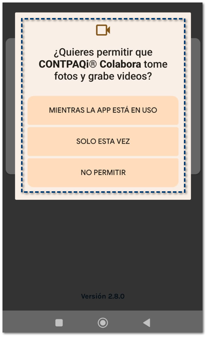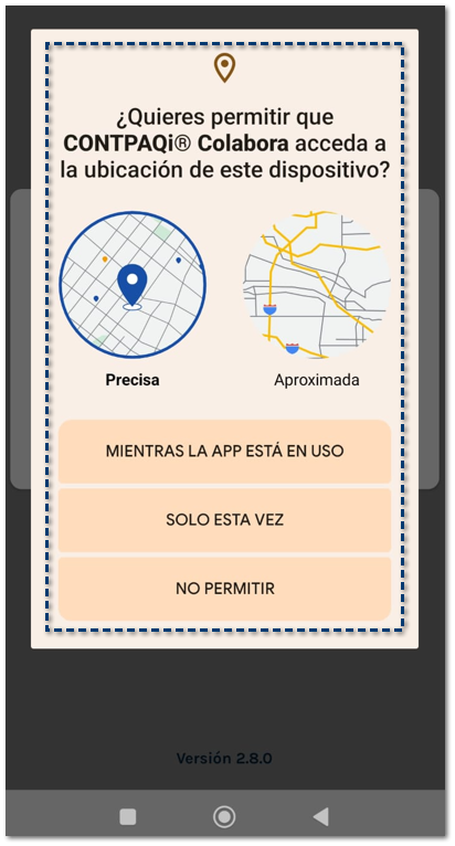 Ingresa a la APP móvil CONTPAQi Colabora® y otorga los permisos solicitados para el uso de la cámara y la ubicación del dispositivo.