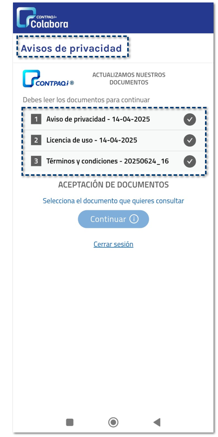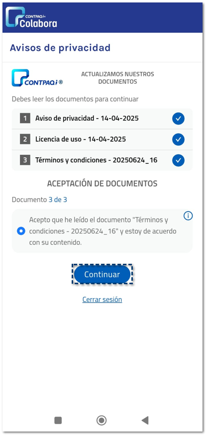 Una vez que has realizado la aceptación de los documentos que tengas pendientes, haz clic en el botón Continuar.