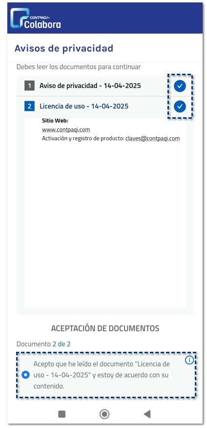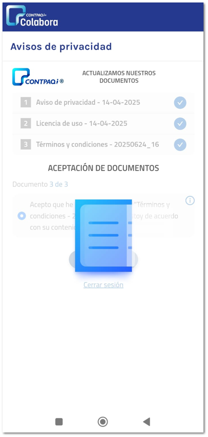 Para ingresar a la empresa, será necesario aceptar los Avisos de privacidad para el uso de los aplicativos CONTPAQi®.