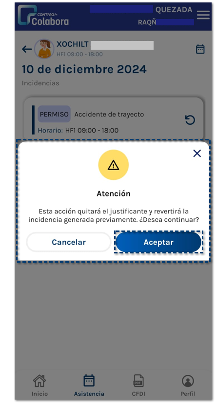 Se mostrará el siguiente confirmación: "Esta acción quitará el justificante y revertirá la incidencia generada previamente. ¿Desea continuar?".