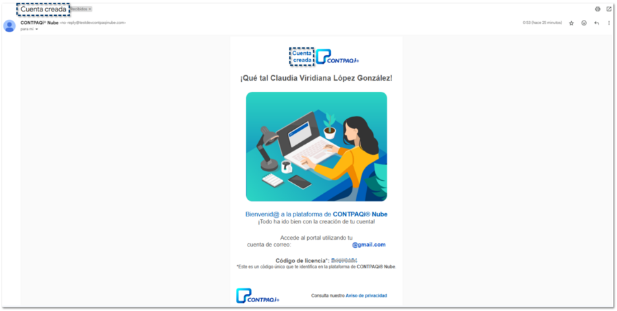 El código de licencia se genera al registrarte y generar tu identidad. Aún cuando cambies el correo electrónico de tu cuenta, el código de licencia no cambia y se mantiene ligado a tu cuenta, además, con dicho código, podrás adquirir los sistemas CONTPAQi® Nube.