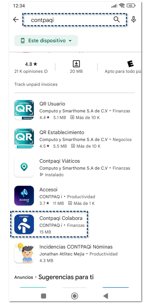 En el campo Buscar apps y juegos, captura las palabras contpaqi colabora y busca resultados: