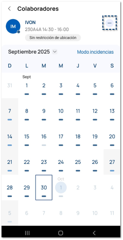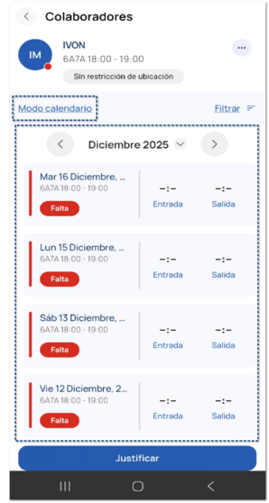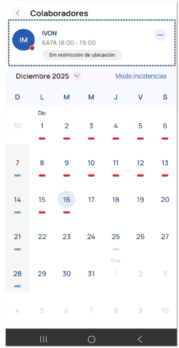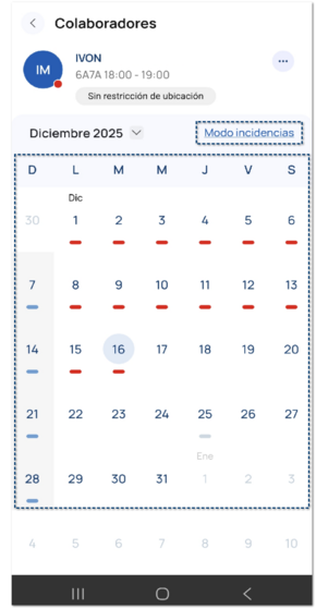 ![]() Además del modo calendario, puedes cambiar la presentación al modo incidencias, que te mostrará el listado de incidencias del colaborador.