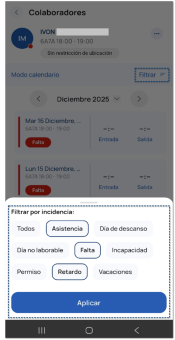 Al seleccionar un colaborador, accederás a su ficha con datos detallados, que te permite revisar por día la asistencia del colaborador y gestionar incidencias específicas: