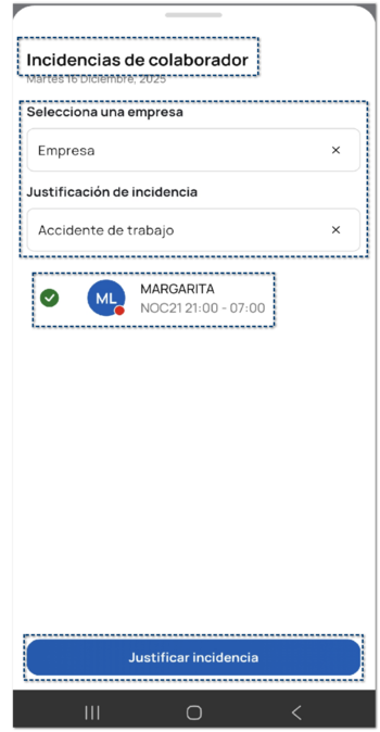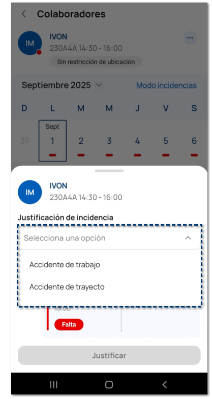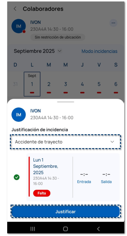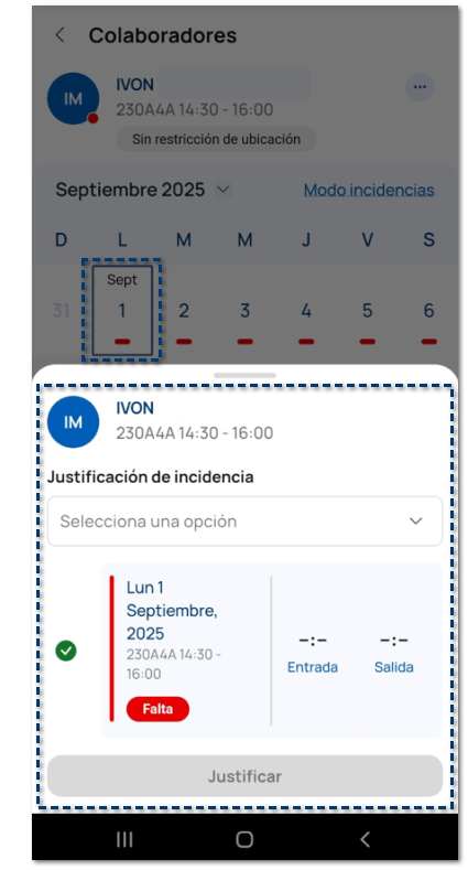 ![]() Si existe al menos un colaborador seleccionado, se muestra un bottom sheet para configurar la justificación de incidencias.