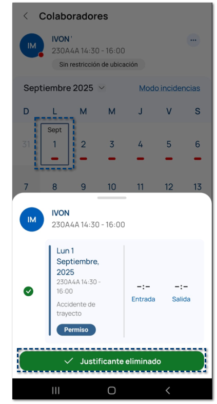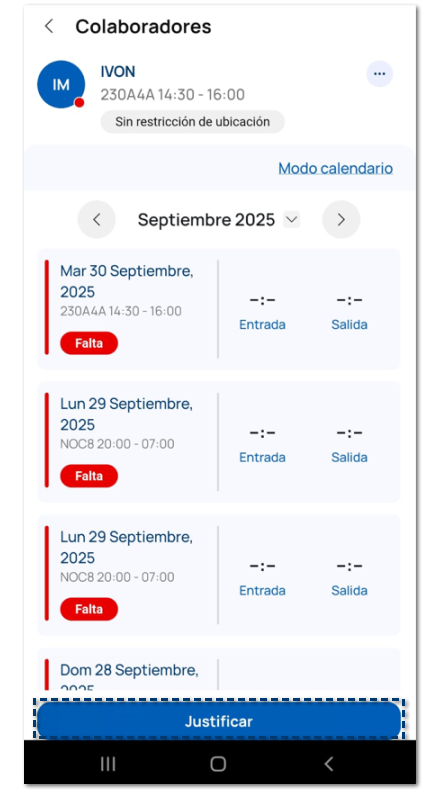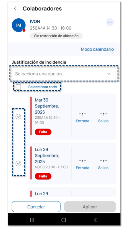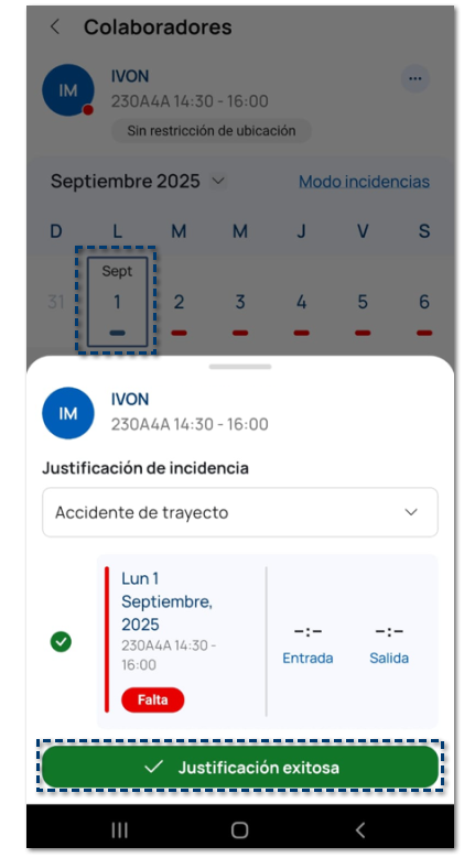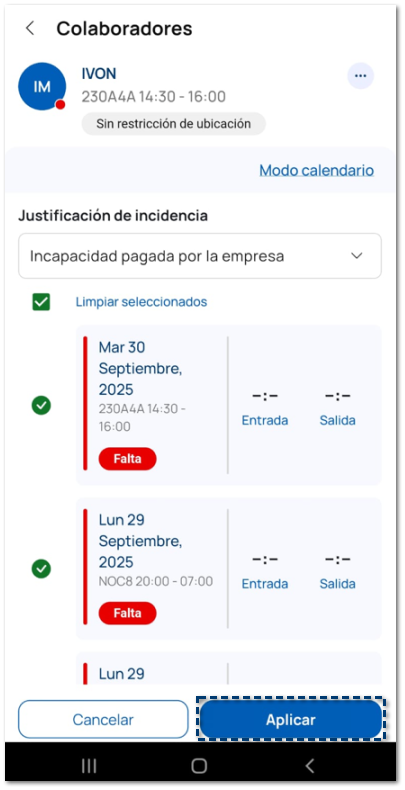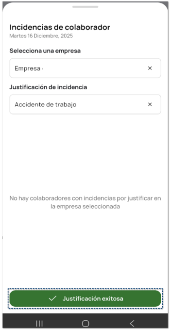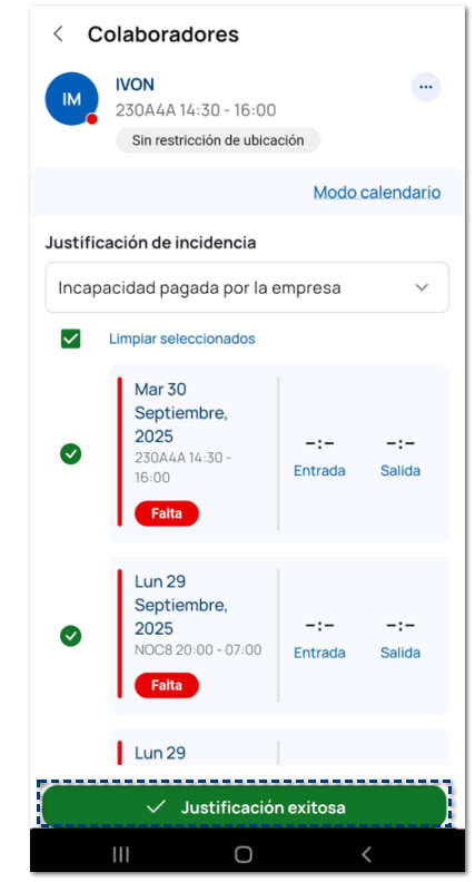 Haz clic en el botón Justificar incidencia para aplicar el justificante a los colaboradores seleccionados.