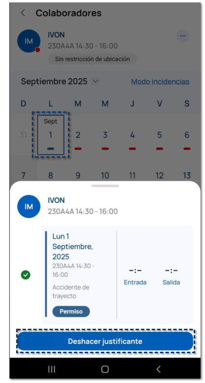 ![]() Si deseas revertir los cambios en la incidencia justificada, selecciona nuevamente el día dentro del calendario y presiona el botón se muestra como Deshacer justificante.