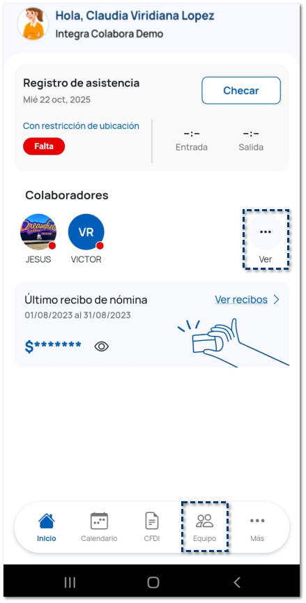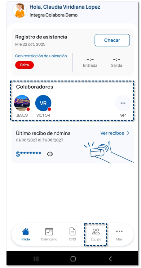 Se muestra la tarjeta de colaboradores a tu cargo en la pantalla principal.