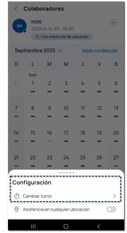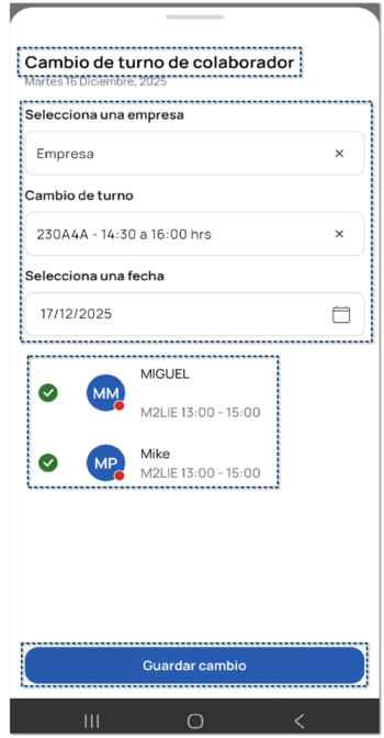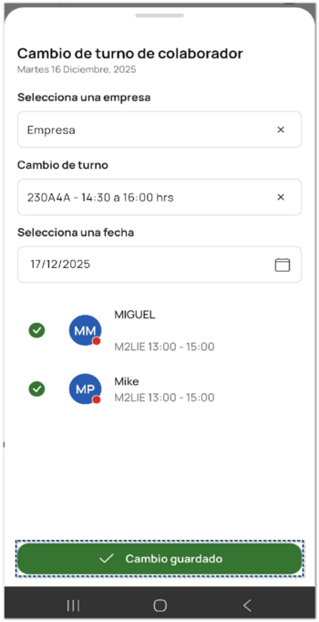 ![]() Si existe al menos un colaborador seleccionado, se muestra un bottom sheet para configurar el cambio de turno.