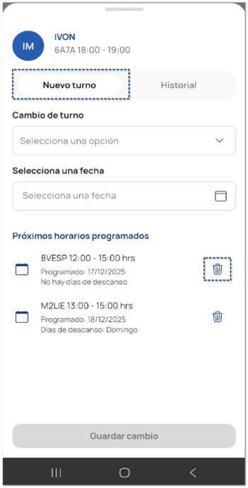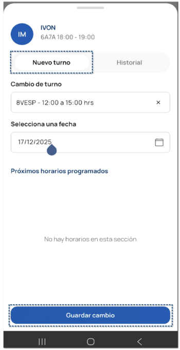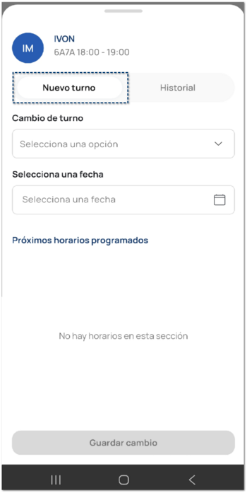 El botón Guardar cambio se habilita únicamente cuando se ha seleccionado un turno, y se ha definido una fecha de aplicación.