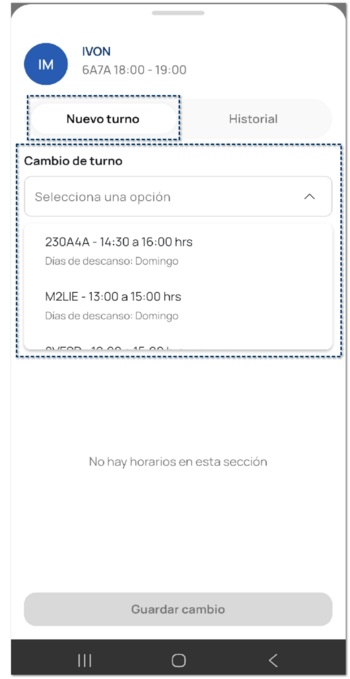 En el campo Cambio de turno, se desplegará el listado de turnos dados de alta en tu empresa. Selecciona el nuevo turno que será asignado al colaborador.