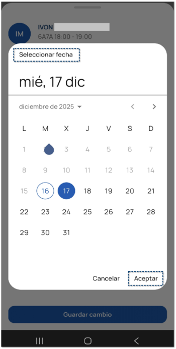 ![]() En el campo Selecciona una fecha, podrás indicar a partir de cuándo entrará en vigor este nuevo turno asignado al colaborador. Selecciona la fecha y presiona el botón Aceptar, para continuar.