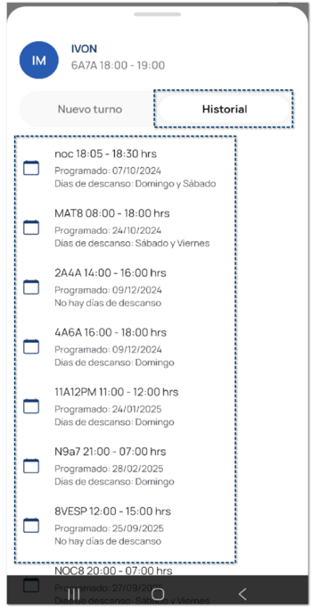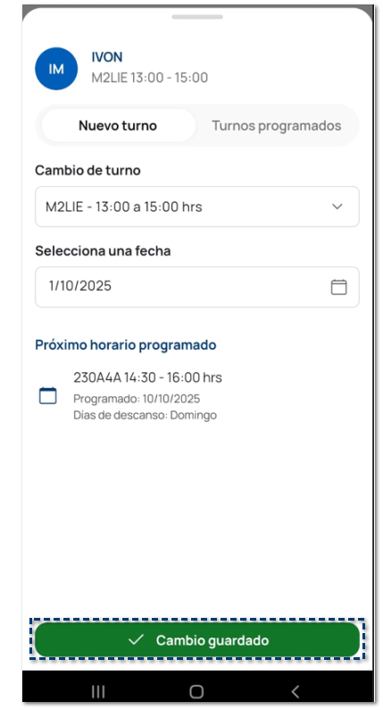 ![]() Si el cambio de turno se aplica correctamente, se mostrará el botón en color verde, que indica Cambio guardado.