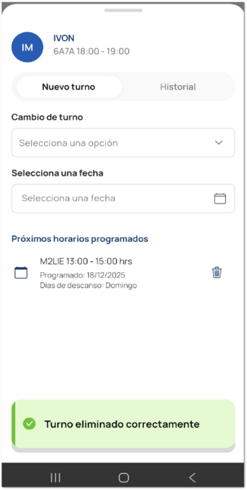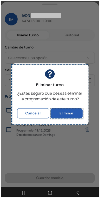 Si deseas eliminar un turno que previamente ha sido programado, presiona el botón Eliminar