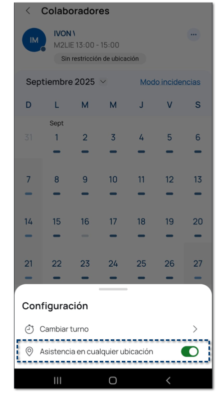 El líder también puede administrar si un colaborador registra su asistencia con o sin restricción de ubicación:
