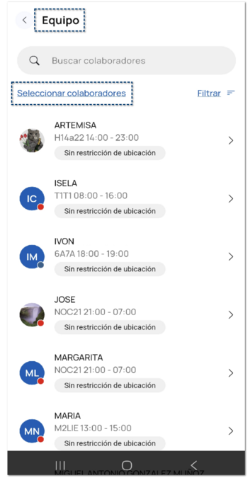 Desde el Listado de equipo, en la parte superior de la pantalla, junto a la opción Filtrar, encontrarás el botón Seleccionar colaboradores.