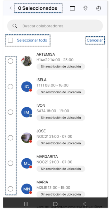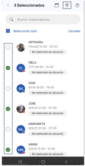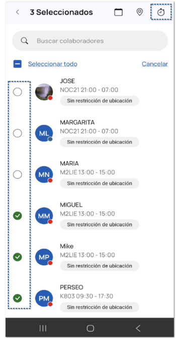 Como Líder, puedes seleccionar uno o varios colaboradores para realizar acciones masivas de forma rápida, como el cambio de turno, la configuración de ubicación o la justificación de incidencias, evitando hacerlo de manera individual.