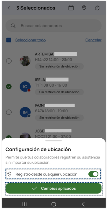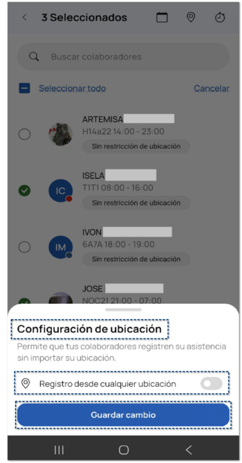 ![]() La opción Configurar ubicación permite definir, de forma masiva, si los colaboradores seleccionados pueden registrar su asistencia desde cualquier ubicación, o si deben hacerlo únicamente desde ubicaciones permitidas.