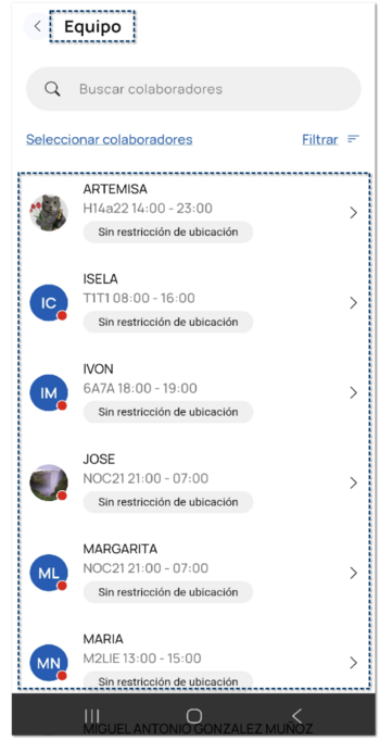 Cuando presionas Ver o el botón Equipo del menú de navegación, visualizarás la lista de colaboradores completos.