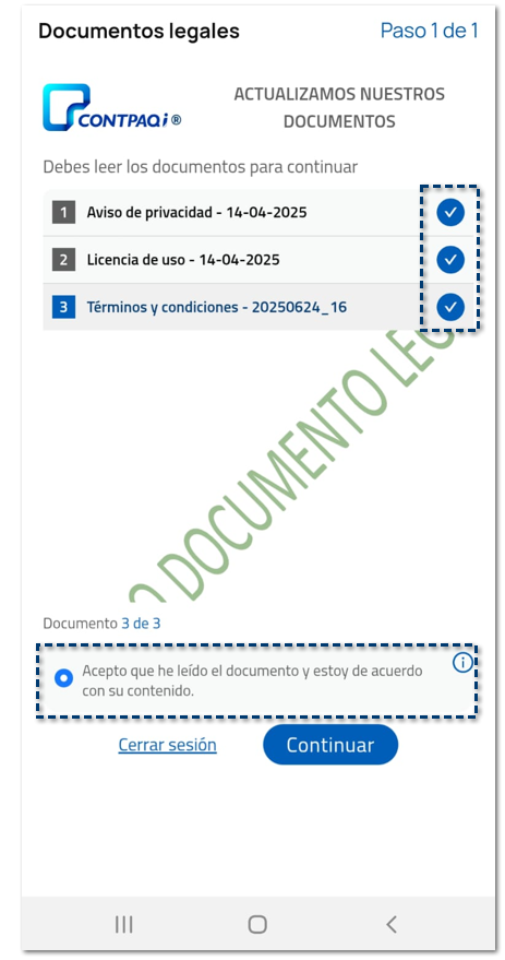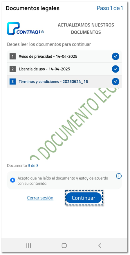 Una vez que has realizado la aceptación de los documentos que tengas pendientes, presiona el botón Continuar.