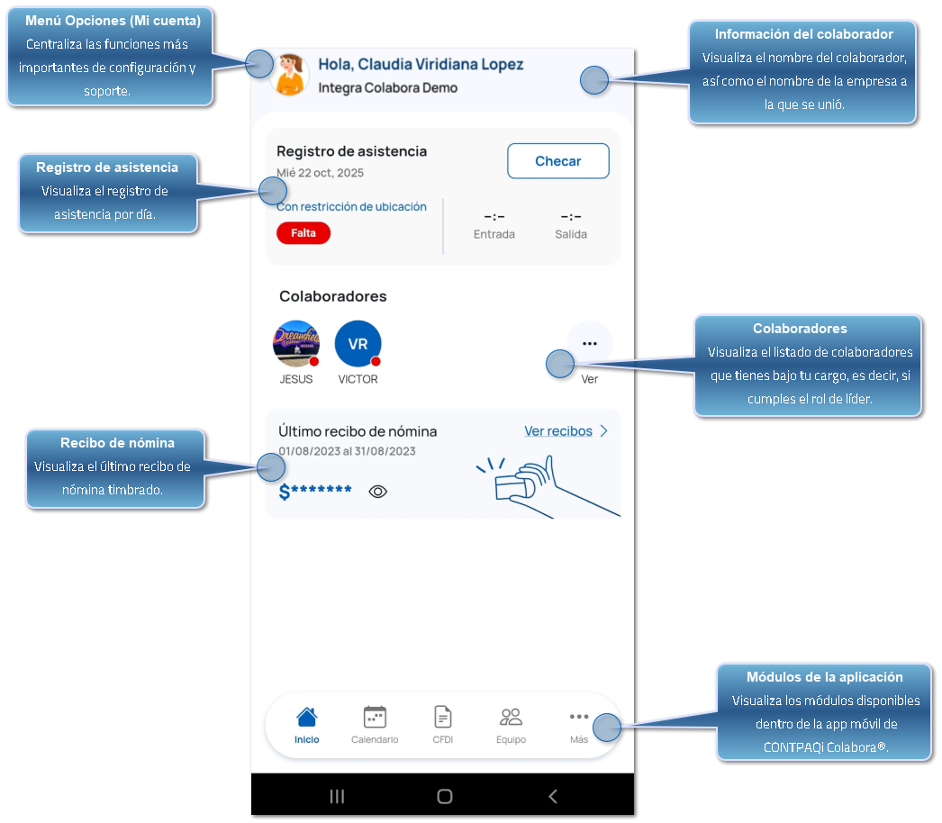 Cuando entres a la app móvil de CONTPAQi Colabora®, lo primero que verás será la pantalla de Inicio (Home), tu panel principal con toda la información de la empresa en la que registrarás tu asistencia.