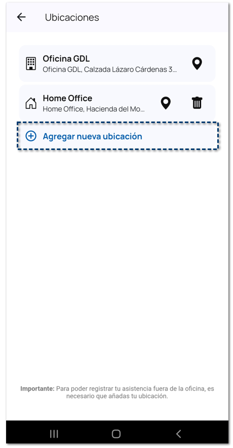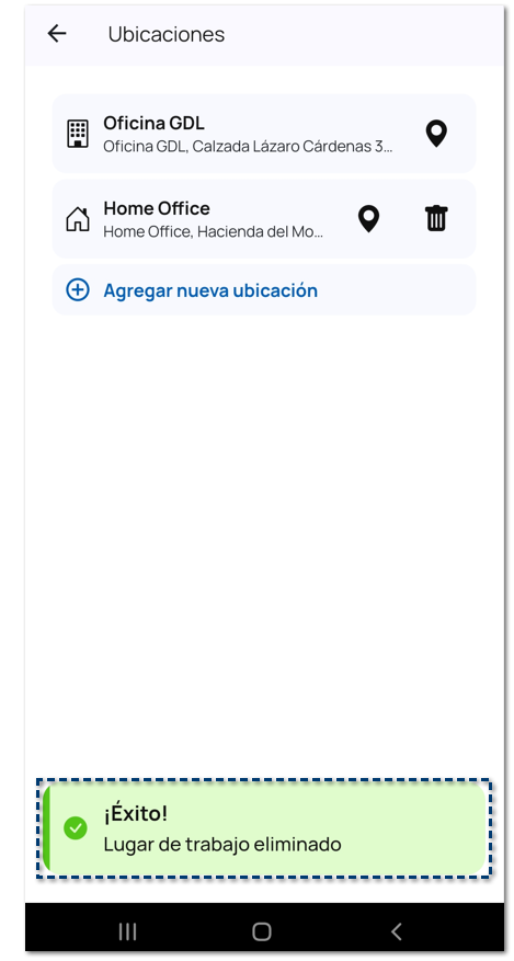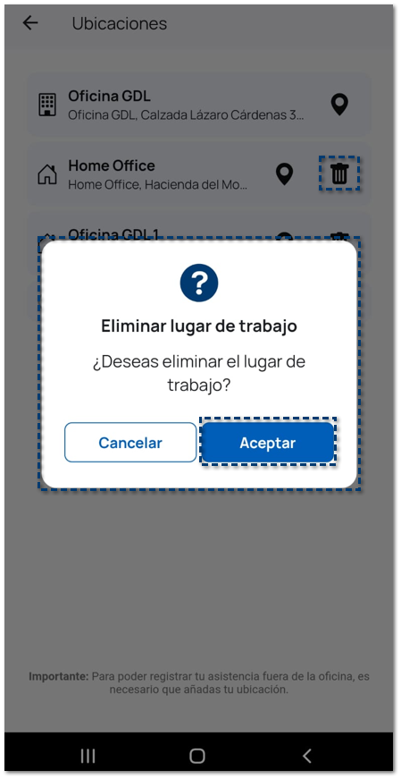 ![]() Por cada lugar de trabajo que agregues para el registro de tu asistencia, según los permitidos por la empresa, se incluye el botón Eliminar