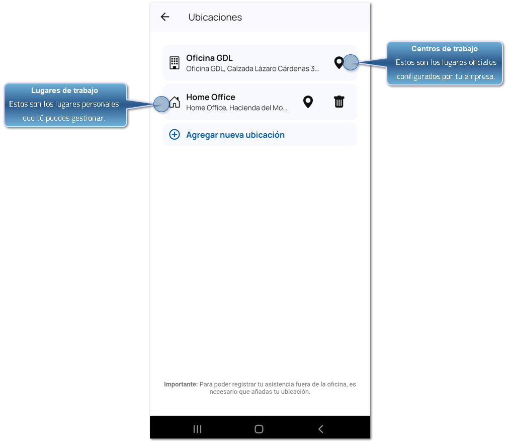 Lugares de trabajo personales: son los que tú como colaborador puedes registrar, por ejemplo tu casa si trabajas en modalidad home office, o un espacio de coworking.