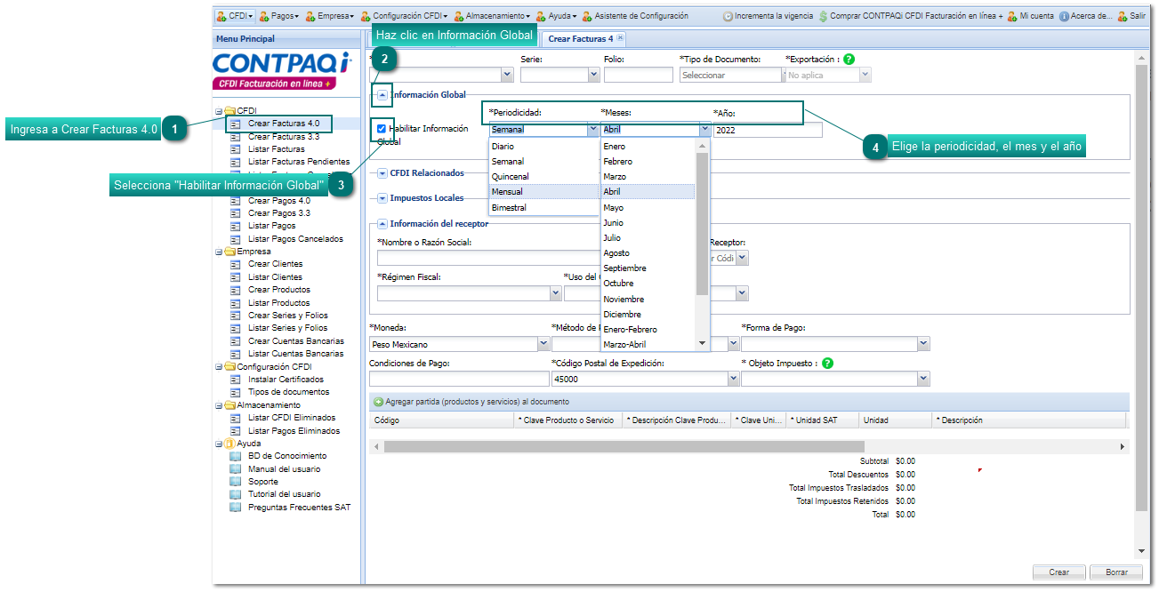 Dentro de la opción Crear Facturas 4.0, haz clic en la sección Información Global, selecciona la casilla "Habilitar Inormación Global" y elige la periodicidad, el mes y el año que correspondan a las operaciones del documento.
