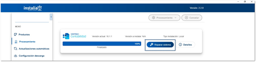 CONTPAQi® Instalia incluye la funcionalidad de reparar una instalación de los productos CONTPAQi®, en caso de existir algún error en la instalación o en el entorno actual detectado por un diagnóstico, se debe dar clic en el botón Reparar para solucionar los detalles, una vez finalizada la reparación se llevará a cabo un nuevo diagnóstico para confirmar si se logró reparar o no la instalación.