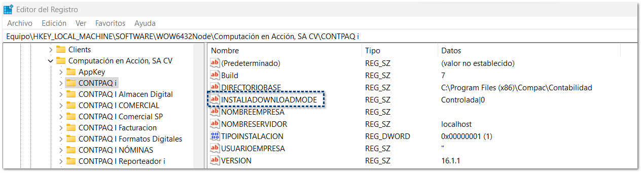 Dentro del REGEDIT observaremos, en la llave correspondiente al sistema CONTPAQi Contabilidad®, el dato InstaliaDOWNLOADMODE que se encuentra con el valor Controlado.