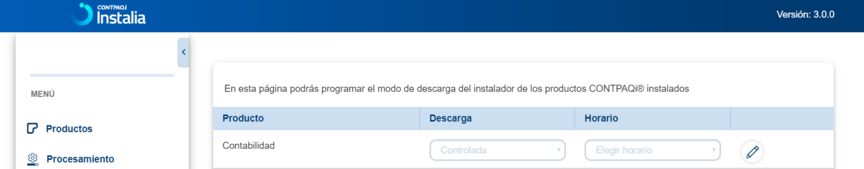 Dentro del menú principal se encontrarás la opción Configura la descarga, que te ayudará a que se realice la descarga de versiones nuevas disponibles para tus sistemas CONTPAQi® instalados y, de esta manera, la actualización de tus sistemas se lleve a cabo en menos tiempo.