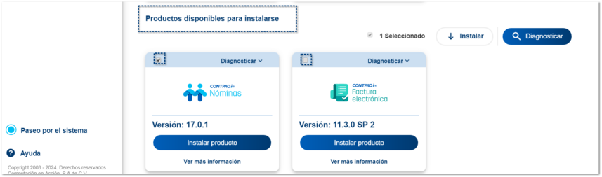 Haz clic en la casilla de selección de cada producto que desees instalar, podrás elegir uno, o todos los sistemas que requieras.