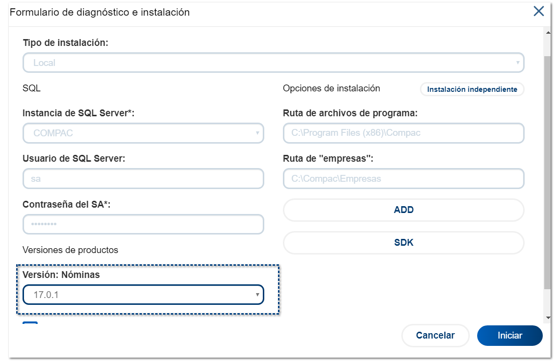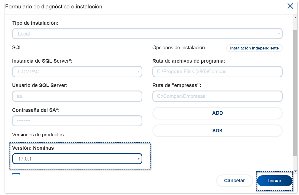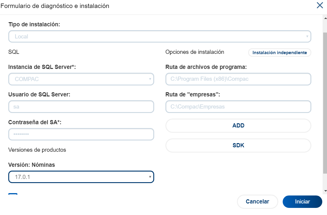 Si se usará la misma instancia para la instalación del producto y sus componentes, es necesario mantener cerrada la opción de ADD, de lo contrario enviará un mensaje de error al querer iniciar con la instalación: