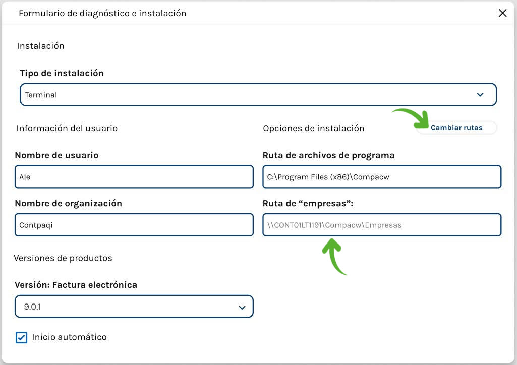 Al instalar CONTPAQi Factura electrónica® como terminal, CONTPAQi Instalia® detecta la ruta de empresas del servidor y la agrega en el campo Ruta de "empresas" del formulario de diagnóstico e instalación. Esto permite que la conexión con la base de datos sea exitosa durante la instalación.