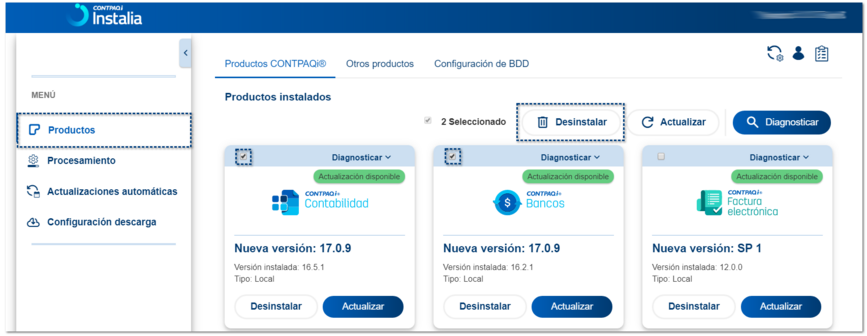 Haz clic en la casilla de selección de cada producto que desees desinstalar, podrás elegir uno, o todos los sistemas que requieras. Haz clic en el botón Desinstalar.