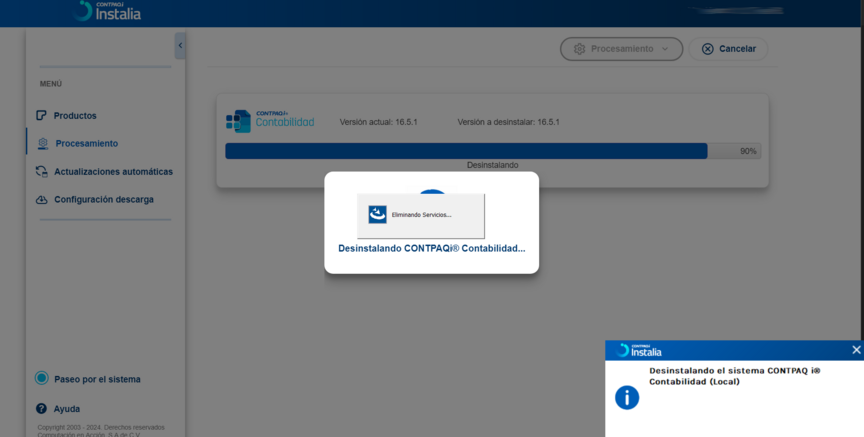 Se mostrará el proceso de desinstalación en la vista de Procesamiento.