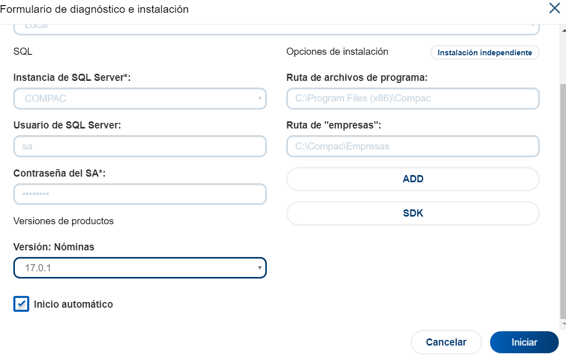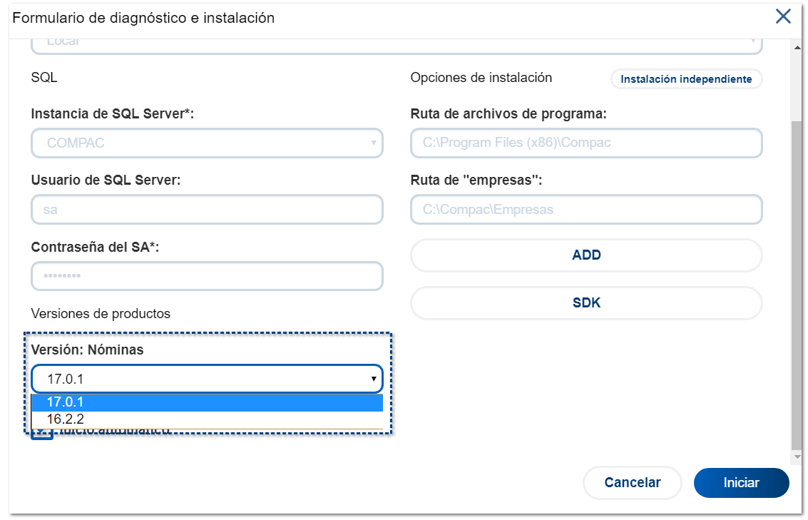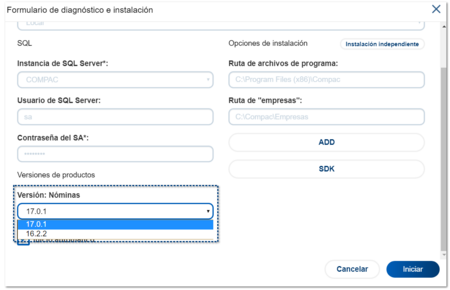 Selecciona la versión a instalar. Una vez indicados los parámetros, haz clic en el botón Iniciar.