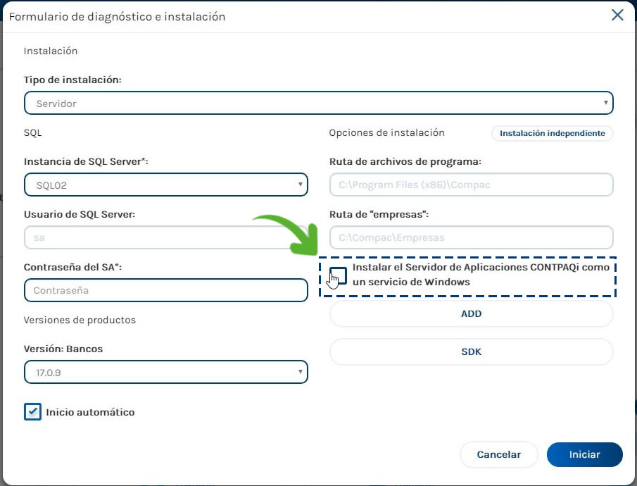 En el formulario de diagnóstico e instalación de CONTPAQi Contabilidad® y CONTPAQi Bancos®, se desplegará la opción de instalar el Servidor de Aplicaciones CONTPAQi® como un servicio de Windows®.