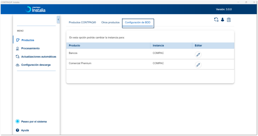 La última pestaña es Configuración BDD, podrás cambiar la instancia para los productos: