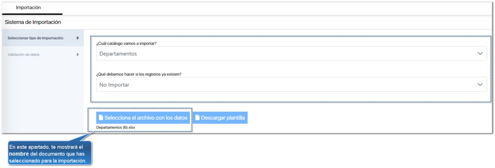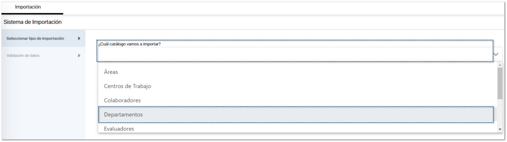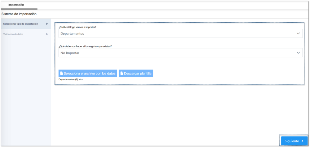Para comenzar, en este ejemplo elegiremos la importación del catálogo de Departamentos. Selecciona dicho catálogo en el listado.