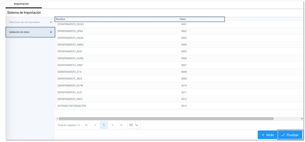 El siguiente paso es la pestaña "Validación de datos", consta de validar la información contenida en el archivo. Al empatar los datos, haz clic en el botón Finalizar.