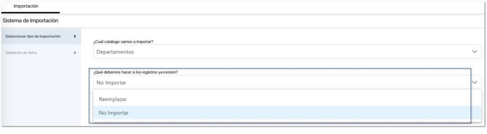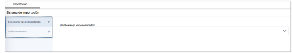 Seleccionar tipo de importación. Será donde elijas que catálogo vas a importar.